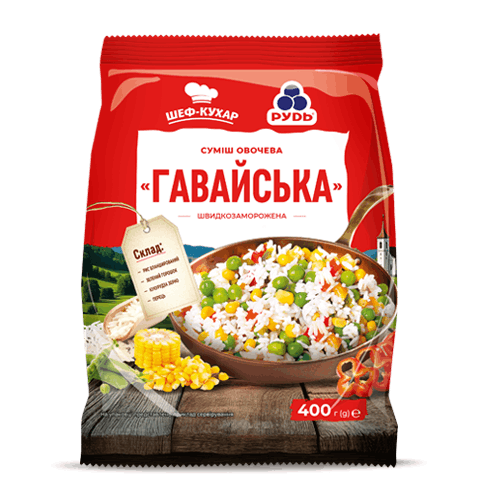 Ingredients: blanched rice, green peas, sweet corn grains, melange bell pepper — diced 10x10 mm. Calorific value per 100 g of product: 99 kcal.