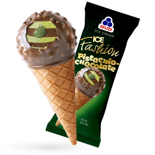 Кремове фісташкове та шоколадне морозиво з насиченим фісташковим соусом — у хрусткому вафельному ріжку.